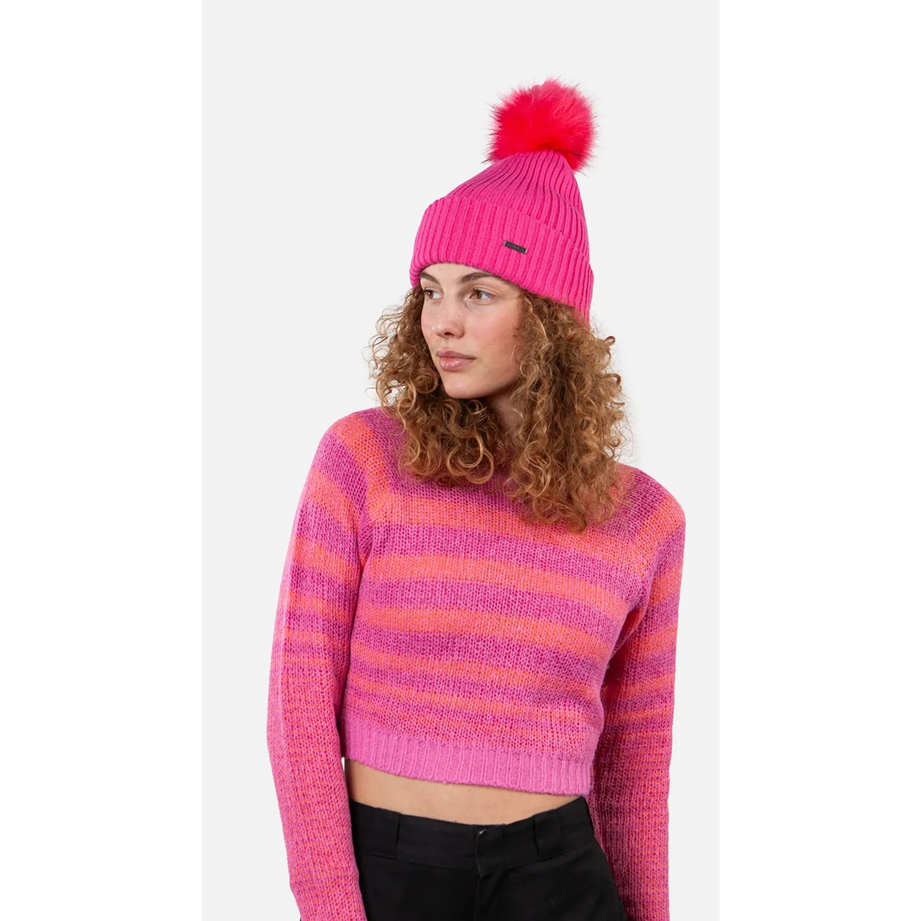 The Kenzie Beanie is soft and stretchy. This beanie has a turn-up and a large faux fur pom.